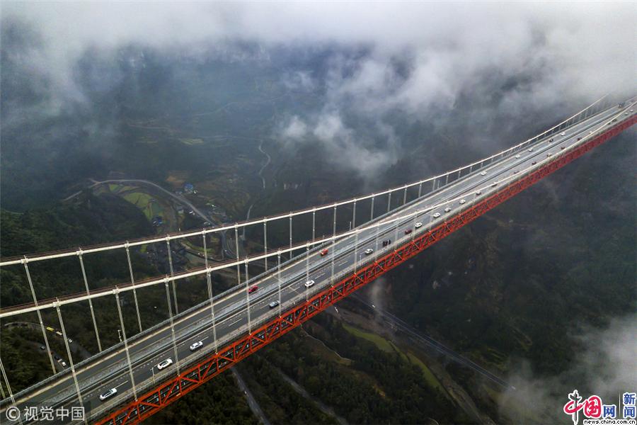 2019年2月10日,湖南省湘西土家族苗族自治州吉首市矮寨镇矮寨大桥,车辆缓慢有序行驶。当日是春节长假最后一天,各地铁路、公路迎来返程客流高峰。刘振军/视觉中国