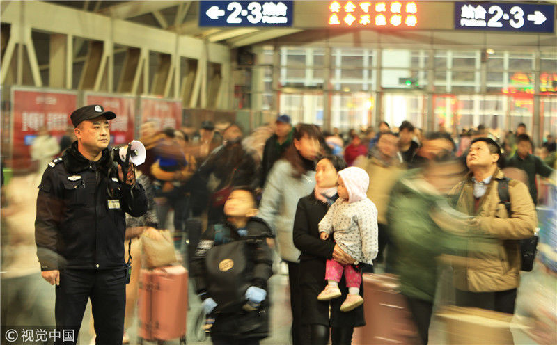 2019年2月10日,湖南衡阳,广州铁路公安局衡阳公安处民警在高铁衡阳东站维护旅客进站秩序。曹正平/视觉中国