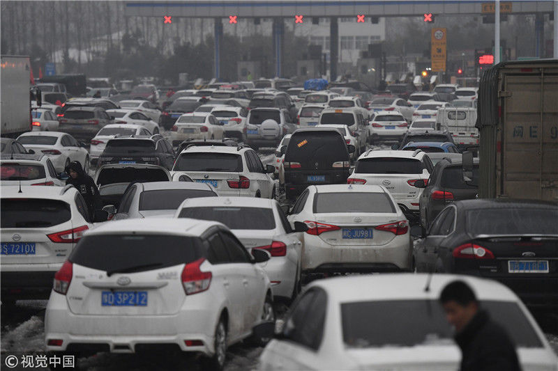 2019年2月9日,安徽六安,图为济广高速霍山入口积压的车辆密密匝匝。江雨/视觉中国