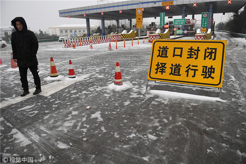 2019年2月9日上午,安徽六安,随着气温的升高,部分高速开始放行,但位于大别山区的济广高速部分入口依然关闭。图为2月9日上午,济广高速安徽霍山入口依然封闭。江雨/视觉中国
