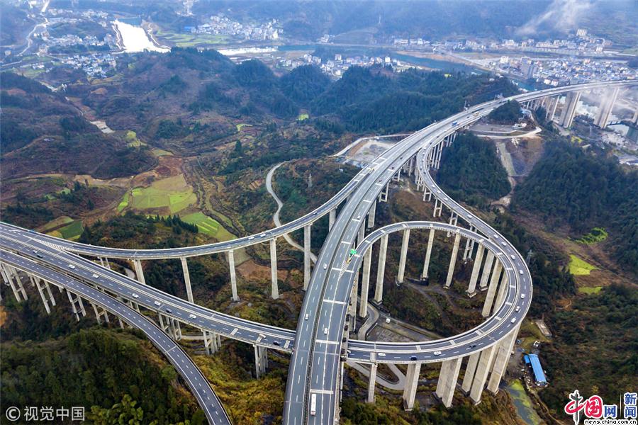2019年2月10日,湖南省湘西土家族苗族自治州吉首市石家冲街道曙光村,永(永顺)吉(吉首)高速公路石家寨互通立交桥,车辆缓慢有序行驶。当日是春节长假最后一天,各地铁路、公路迎来返程客流高峰。刘振军/视觉中国