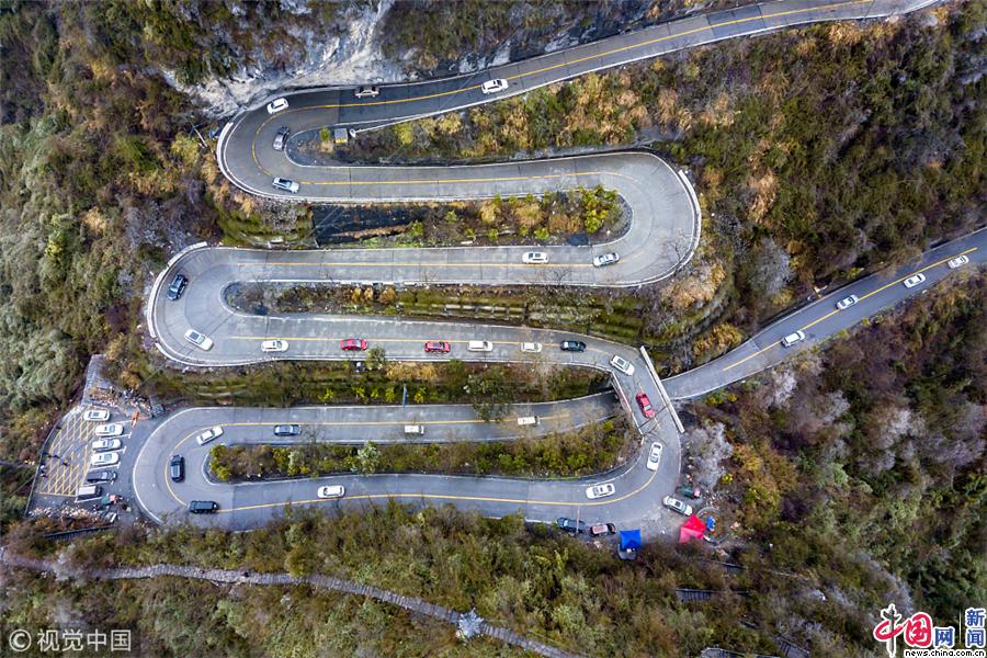 2019年2月10日,湖南省湘西土家族苗族自治州吉首市矮寨镇矮寨盘山公路,车辆缓慢有序行驶。当日是春节长假最后一天,各地铁路、公路迎来返程客流高峰。刘振军/视觉中国