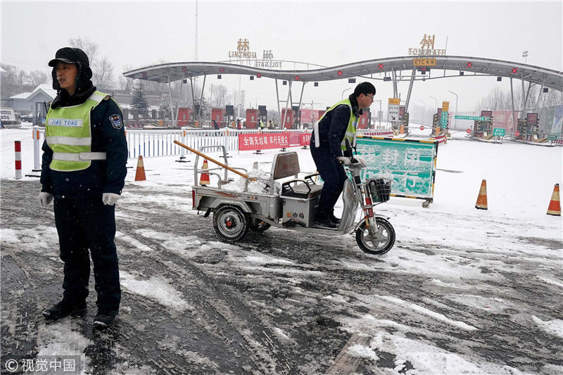2019年2月10日清晨,河南省林州市降雪,高速公路临时封闭。张宇(摄影部)/中新社/视觉中国