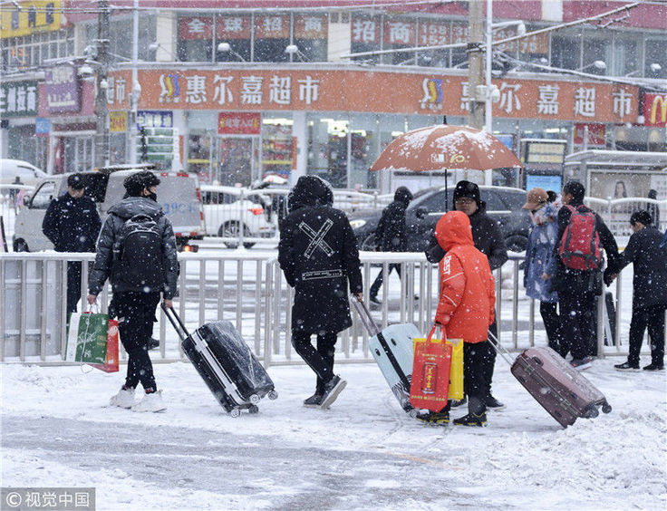 2019年2月10日,农历正月初六日,春运进入第二十一天,郑州火车站客流量迎来春节过后高峰,春节假期剩余最后一天,返城旅客明显增多,虽然天降大雪却难挡返城人们。吴贤德/视觉中国