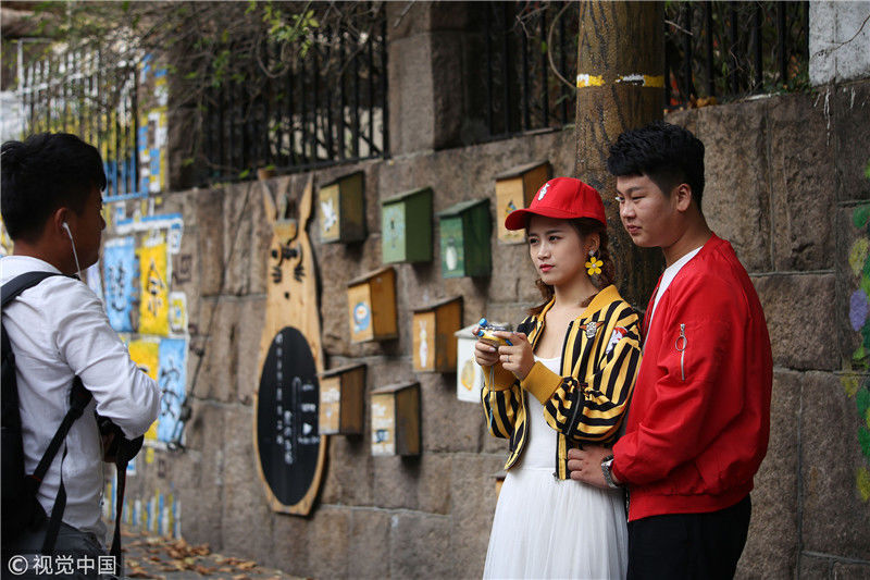 2018年10月8日,“文艺青年”在青岛海滨大学路街区拍照。黄杰显/视觉中国
