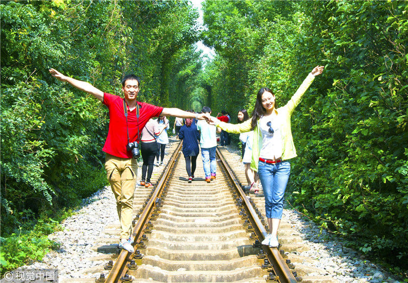 2014年09月20日,江苏省南京市,新景观“爱情隧道”受游客追捧。一对情侣“爱情隧道”游玩。谷昌旺/视觉中国