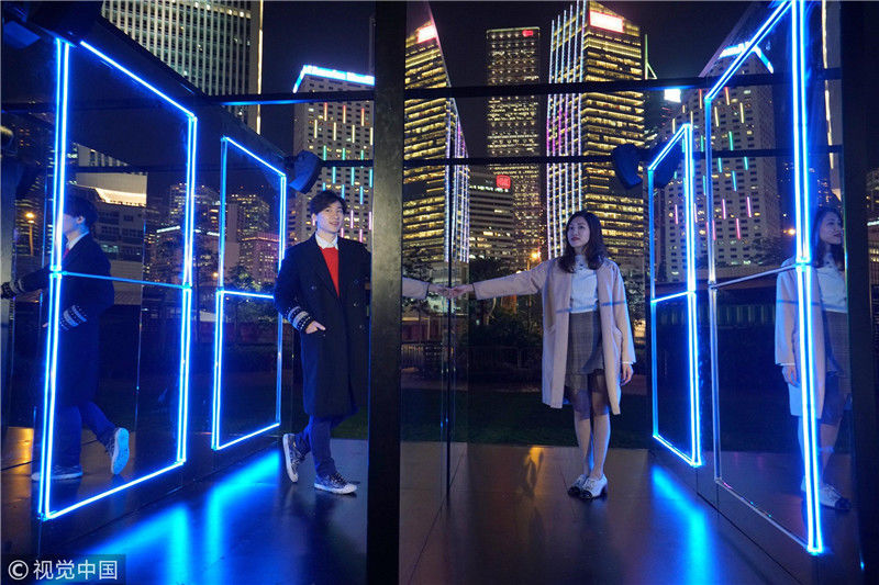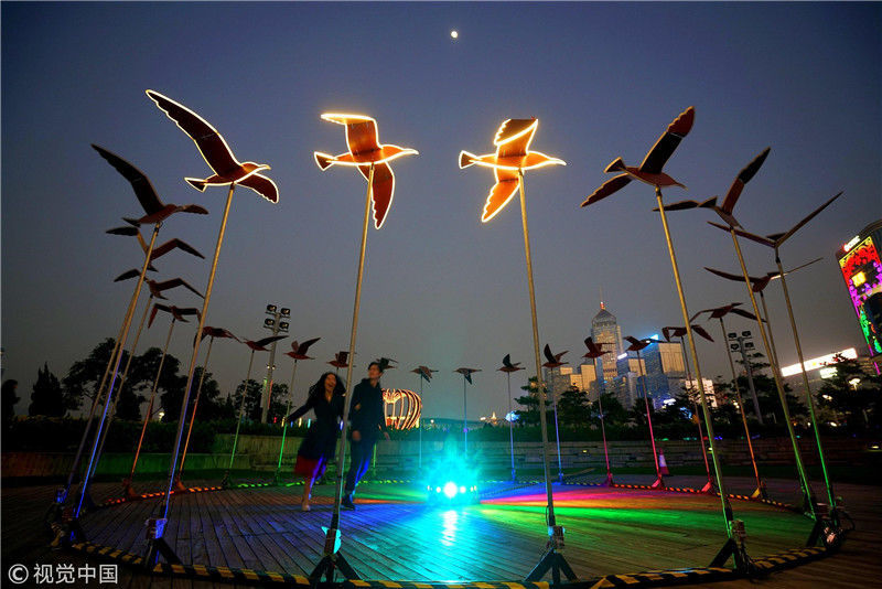 2019年1月17日,香港,香港旅发局近月一直举办“闪跃维港灯影节”,其中“国际灯光艺术展”新一期的主题定为“爱与浪漫”,共15件外地和香港灯光作品。17日起开始至2月24日在香港中环海滨展出,料会在元宵及情人节成为情侣的“打卡”热点。旅发局估计,活动最终可以吸引超过100万人次。Anthony Kwan/视觉中国