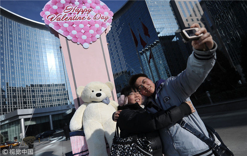 2012年2月11日,北京东方广场,一对情侣在熊玩偶前自拍留念。法制晚报郭谦/视觉中国