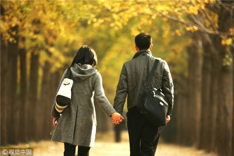 2008年10月28日下午,在钓鱼台国宾馆东墙外的银杏林里,一对情侣在”银杏走廊“内牵手散步。京华时报王磊/视觉中国