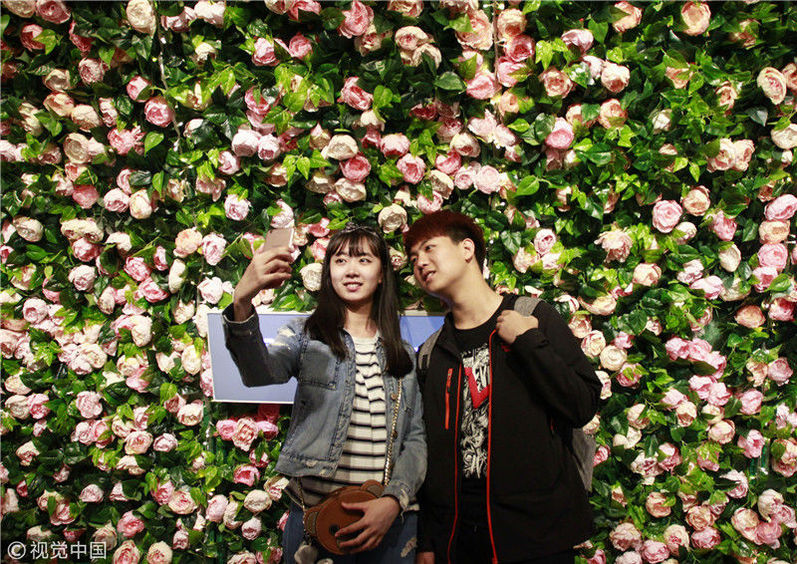 2018年5月5日,辽宁沈阳。一大型商场别出心裁,一巨大拱形通道内镶满玫瑰花,行走在拱形通道内,如置身于烂漫的花海中,引逛街市民争相拍照留念。蔡靖宇/视觉中国