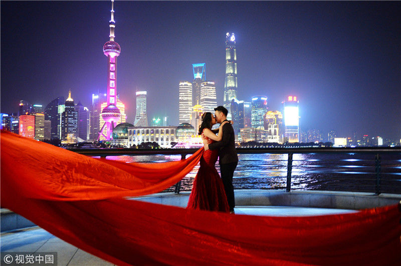 2017年12月17日,上海,夜幕下,一对热恋青年在寒风中拍摄婚纱照。视觉中国