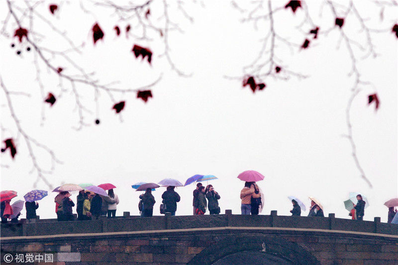 2005年2月14日,情侣们在杭州西湖断桥上相拥合影,以示爱意。周广利/视觉中国