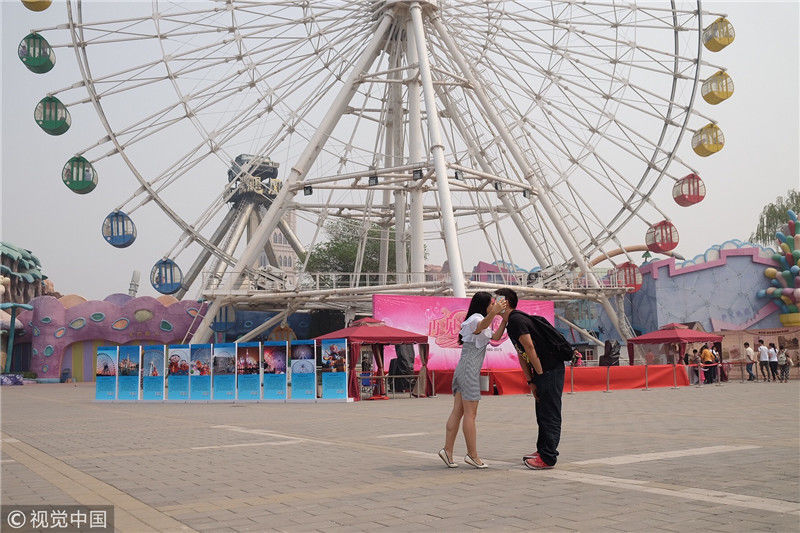 2015年04月30日,北京,石景山游乐园内的摩天轮营业的最后一天。一对情侣站在摩天轮下接吻拍照留念。小山/视觉中国