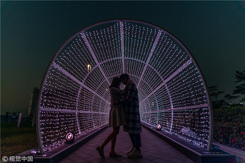 2019年1月17日,香港,香港旅发局近月一直举办“闪跃维港灯影节”,其中“国际灯光艺术展”新一期的主题定为“爱与浪漫”,共15件外地和香港灯光作品。17日起开始至2月24日在香港中环海滨展出,料会在元宵及情人节成为情侣的“打卡”热点。旅发局估计,活动最终可以吸引超过100万人次。Anthony Kwan/视觉中国
