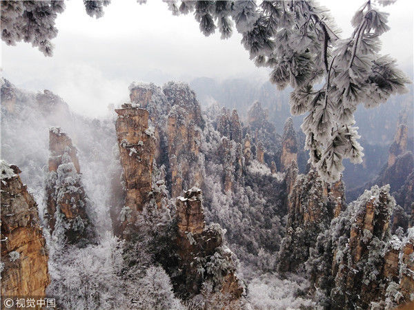湖南张家界:雾凇冰挂云海美景同现 武陵源春雪惹人醉