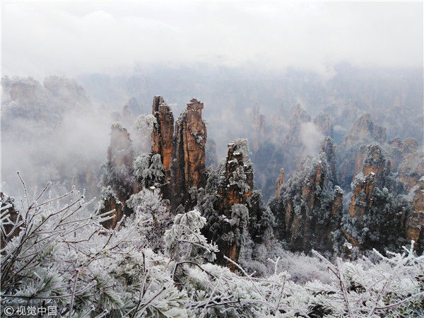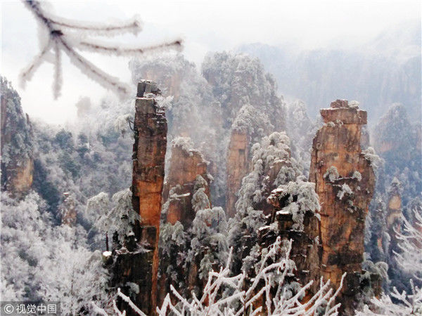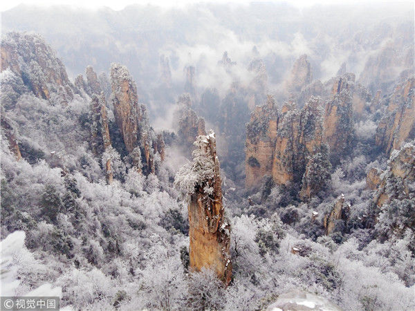 2019年2月11日,世界自然遗产地湖南省张家界武陵源天子山景区赏雪游客络绎不绝,同现的雾凇、冰挂、云海奇观更是让各地游客流连忘返。