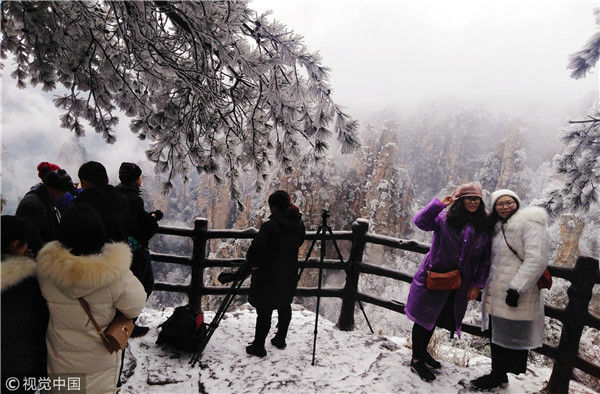 2019年2月11日,世界自然遗产地湖南省张家界武陵源天子山景区赏雪游客络绎不绝,同现的雾凇、冰挂、云海奇观更是让各地游客流连忘返。邓道理/视觉中国
