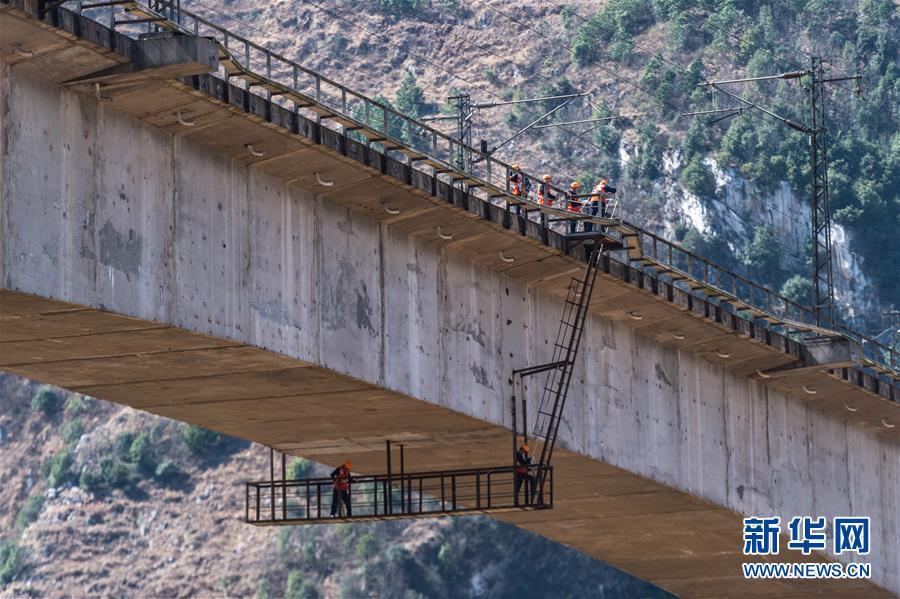 2月12日,六盘水工电段的桥隧工人在对天生桥特大桥进行巡检。 春运期间,中国铁路成都局集团有限公司六盘水工电段的桥隧工人坚守在位于乌蒙山区沪昆铁路天生桥特大桥检查岗位上,保障春运列车安全通行。 新华社记者 陶亮 摄