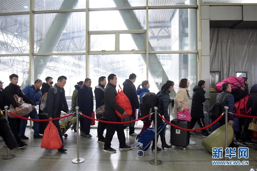 2月13日,安徽阜阳火车站内,旅客们前往站台。 当日是农历正月初九,民间有“三六九,往外走”的习俗,各地铁路运输迎来节后新一轮客流潮。 新华社记者郭晨摄