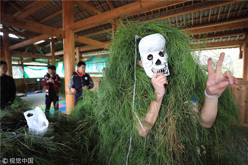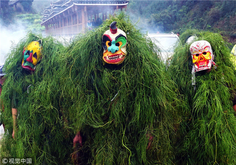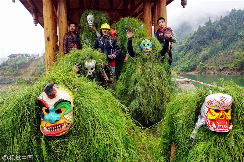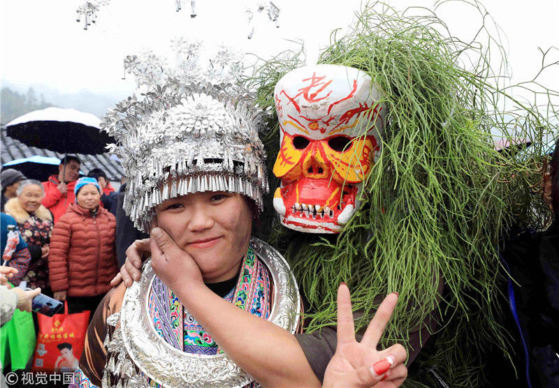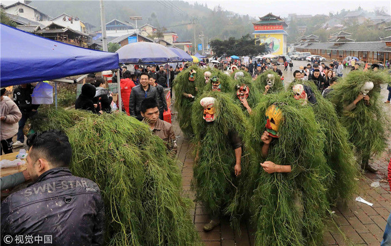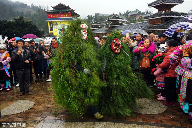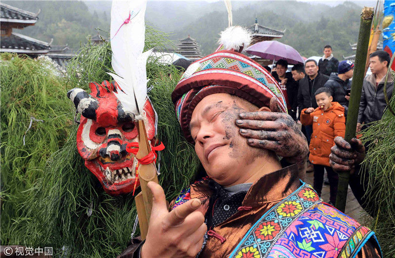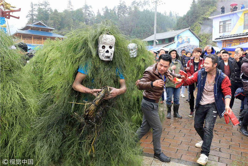 2019年2月13日,农历正月初九,是广西柳州市融安县长安镇安宁村大袍苗寨一年一度的传统节日“芒篙节”,当地苗族青年装扮成“芒篙”,将手上涂的锅灰拍到别人身上,代表送去新春祝福之意。“芒篙”相传是当地苗族群众的福神,苗族祖先用古树刻成面具,披着芒篙藤制成的蓑衣,脸上涂抹黑灰扮演野人,成功抵御山匪侵扰。谭凯兴/视觉中国