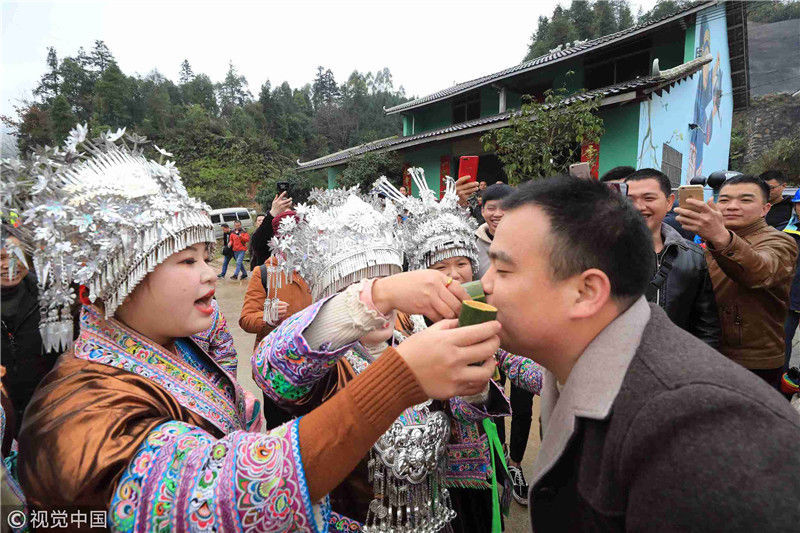 2019年2月13日,在广西柳州融安县安宁村大袍屯举行的“芒蒿节”上,一名游客在喝“拦路酒”。
