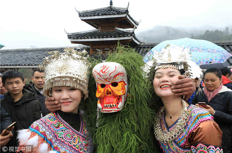 2019年2月13日,在广西柳州融安县安宁村大袍屯举行的“芒蒿节”上,装扮成“芒蒿”的青年为两名苗族姑娘抹灰送福。