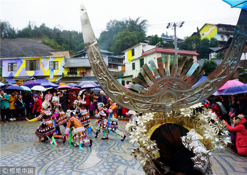 2019年2月13日,在广西柳州融安县安宁村大袍屯,苗族群众在表演歌舞。
