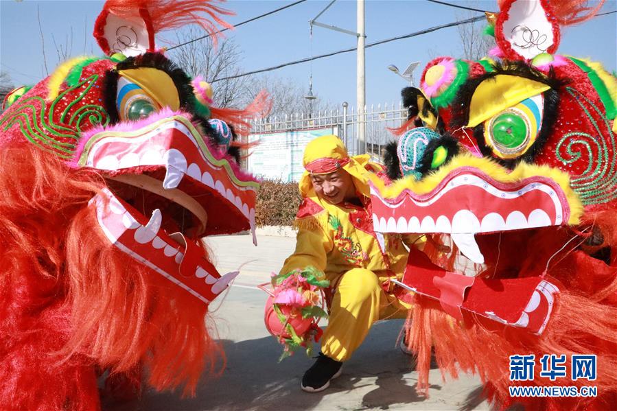 在甘肃省庆阳市西峰区肖金镇左咀村文体广场,左咀村的舞狮队在表演(2月1日摄)。