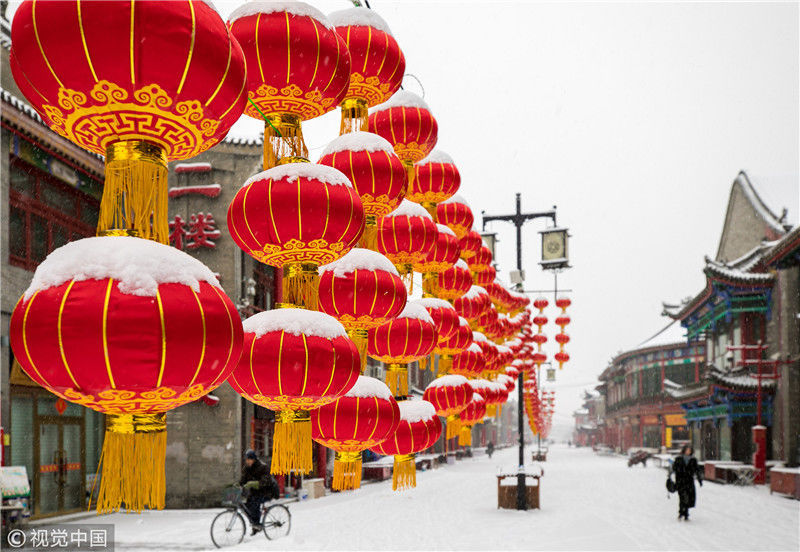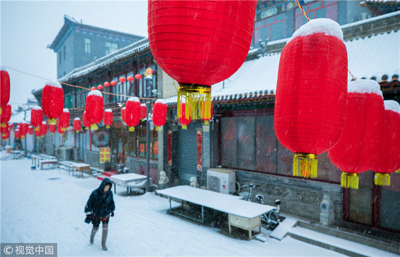 2019年2月14日,在呼和浩特市玉泉区塞上老街,游客冒雪出行。