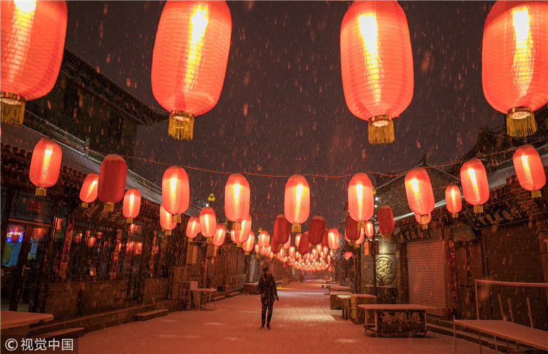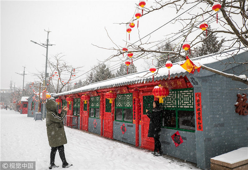 2019年2月14日,游客在呼和浩特市玉泉区塞上老街赏雪景。