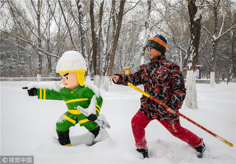 2019年2月14日,内蒙古呼和浩特市迎来农历新年后首场降雪天气,整个城市变得银装素裹。 图为游客在呼和浩特市玉泉区大召广场赏雪景。丁根厚/视觉中国