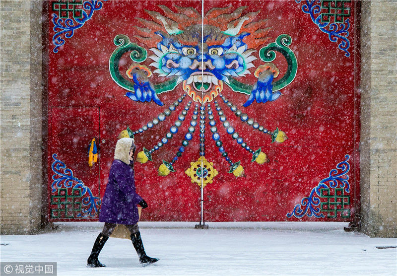 2019年2月14日,在呼和浩特市玉泉区大召广场,游客冒雪出行。