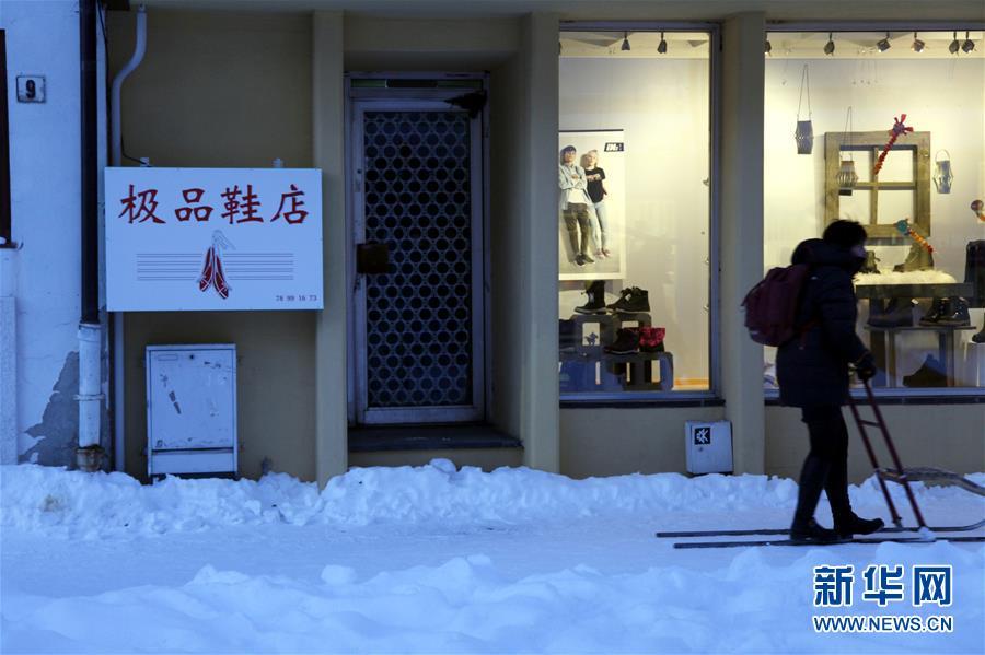 2月13日,在挪威北部小镇希尔克内斯,行人从一间挂有中文招牌的商店前经过。 13日,以“世界最北端的中国城”为主题的2019年巴伦支盛典活动在希尔克内斯开幕。为期5天的巴伦支盛典是希尔克内斯从2004年开始举行的年度跨境庆典活动,今年以中国为主题。 新华社记者梁有昶摄