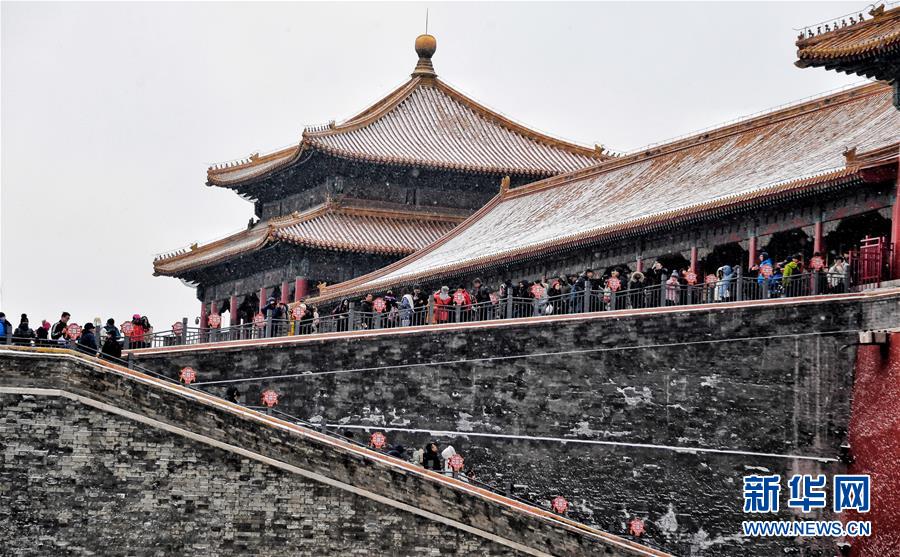 2月14日,游客在雪中游览北京故宫。 当日,北京降雪,大批游人来到故宫游览赏雪。 新华社记者 李欣 摄