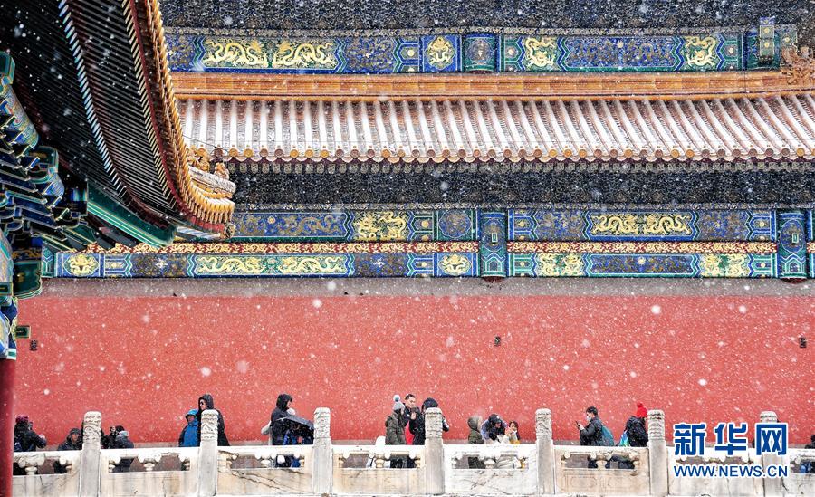 2月14日,游客在雪中游览北京故宫。 当日,北京降雪,大批游人来到故宫游览赏雪。 新华社记者 李欣 摄