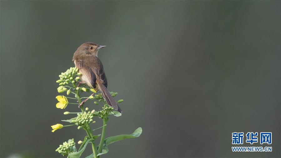 一只小鸟在油菜花枝头上停歇(2月15日摄)。 新华社记者梅永存摄