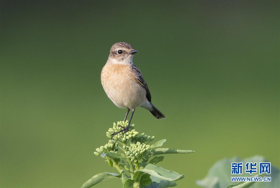 一只小鸟在油菜花枝头上停歇(2月15日摄)。 新华社记者梅永存摄