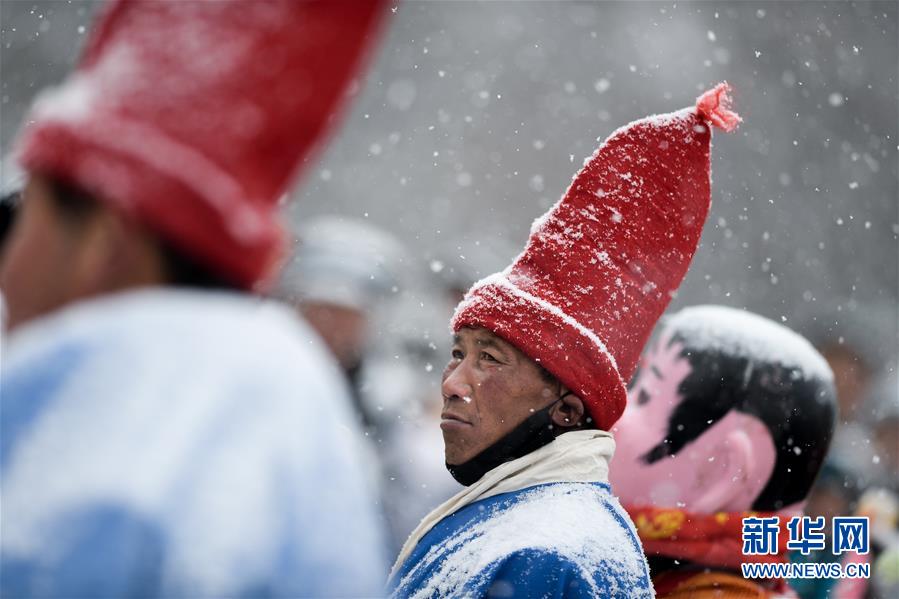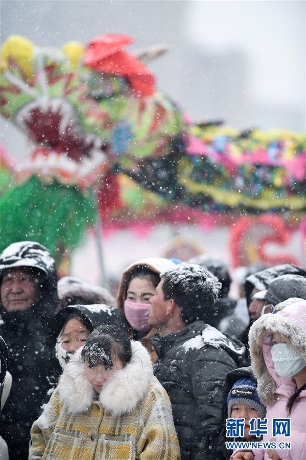 2月16日,群众在青海省大通回族土族自治县文化广场冒雪观看社火表演。新华社记者吴刚摄