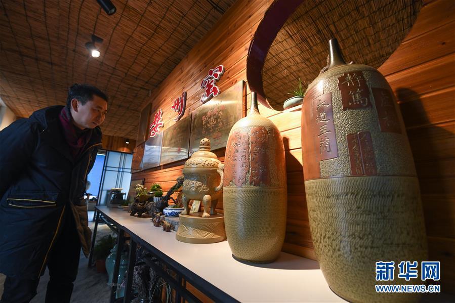 2月16日,一名游客在婺窑小镇陈新华的工作室内观看婺州窑作品。新华社记者 徐昱 摄