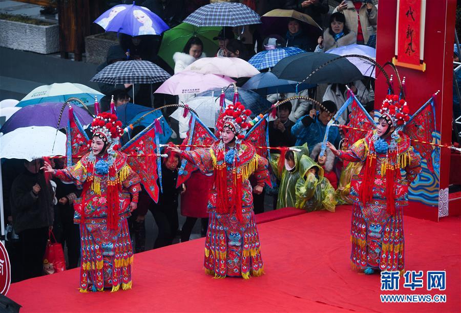 2月17日,村民们在观看传统戏剧表演。 当日,浙江省杭州市富阳区湖源乡窈口村举办“别样元宵、年味乡愁”雨水节气活动,以年味和乡愁为主题,舞板龙唱大戏,展示国家级生态文化村窈口村的美丽乡村和独特的山水自然环境,在浓浓的传统山乡喜庆氛围中迎接元宵节。 窈口板龙源自清代,由当时走南闯北经商的村民从北方引进村内。长达130米的板龙由58张板凳连起来,板凳上有各种场景的灯笼装饰,近百名舞龙队员身穿传统服装,随着锣鼓的欢快节奏舞起龙灯,祈求新的一年风调雨顺。 新华社记者 徐昱 摄