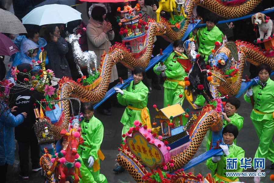 2月17日,乡村女子舞龙队队员抬着特色的板龙在窈口村的广场上进行表演,展示这一当地的非物质文化遗产(无人机拍摄)。 当日,浙江省杭州市富阳区湖源乡窈口村举办“别样元宵、年味乡愁”雨水节气活动,以年味和乡愁为主题,舞板龙唱大戏,展示国家级生态文化村窈口村的美丽乡村和独特的山水自然环境,在浓浓的传统山乡喜庆氛围中迎接元宵节。 窈口板龙源自清代,由当时走南闯北经商的村民从北方引进村内。长达130米的板龙由58张板凳连起来,板凳上有各种场景的灯笼装饰,近百名舞龙队员身穿传统服装,随着锣鼓的欢快节奏舞起龙灯,祈求新的一年风调雨顺。 新华社记者 徐昱 摄