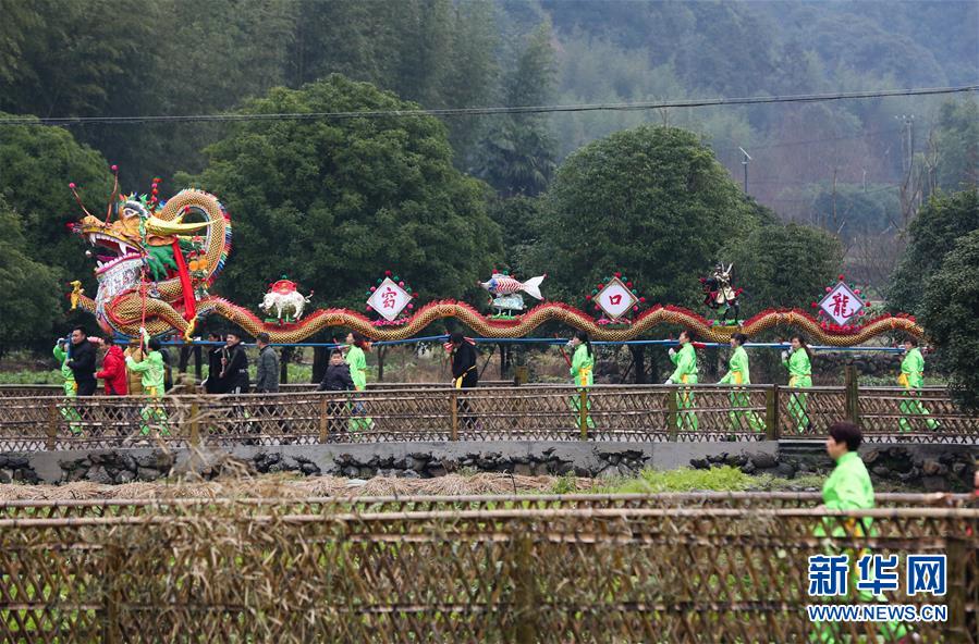 2月17日,乡村女子舞龙队队员抬着特色的板龙在窈口村中表演(无人机拍摄)。 当日,浙江省杭州市富阳区湖源乡窈口村举办“别样元宵、年味乡愁”雨水节气活动,以年味和乡愁为主题,舞板龙唱大戏,展示国家级生态文化村窈口村的美丽乡村和独特的山水自然环境,在浓浓的传统山乡喜庆氛围中迎接元宵节。 窈口板龙源自清代,由当时走南闯北经商的村民从北方引进村内。长达130米的板龙由58张板凳连起来,板凳上有各种场景的灯笼装饰,近百名舞龙队员身穿传统服装,随着锣鼓的欢快节奏舞起龙灯,祈求新的一年风调雨顺。 新华社记者 徐昱 摄
