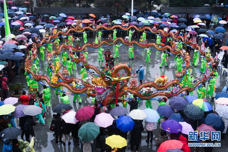 2月17日,乡村女子舞龙队队员抬着特色的板龙在窈口村的广场上进行表演。 当日,浙江省杭州市富阳区湖源乡窈口村举办“别样元宵、年味乡愁”雨水节气活动,以年味和乡愁为主题,舞板龙唱大戏,展示国家级生态文化村窈口村的美丽乡村和独特的山水自然环境,在浓浓的传统山乡喜庆氛围中迎接元宵节。 窈口板龙源自清代,由当时走南闯北经商的村民从北方引进村内。长达130米的板龙由58张板凳连起来,板凳上有各种场景的灯笼装饰,近百名舞龙队员身穿传统服装,随着锣鼓的欢快节奏舞起龙灯,祈求新的一年风调雨顺。 新华社记者 徐昱 摄