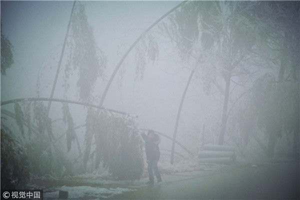 2019年2月16日,安徽安庆,岳西县鹞落坪国家级自然保护区境内出现雾凇景观,处处银装素裹分外美丽。吴均奇/视觉中国