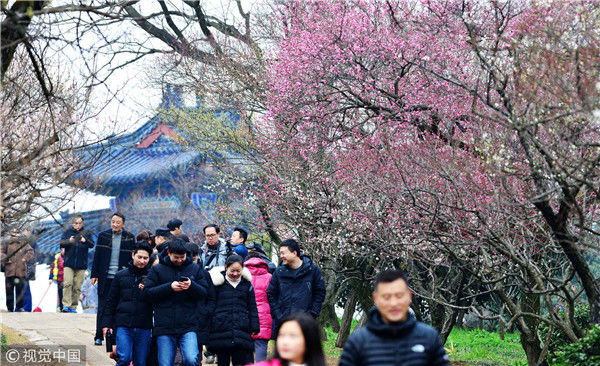 2019年2月16日,江苏南京,人们在梅花山赏梅踏春、拍照留念。