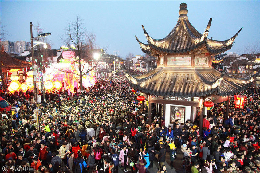 2017年02月11日,江苏省南京市,农历正月十五元宵佳节,南京夫子庙景区主题为“金鸡迎盛世·花灯耀古城”的第31届中国·秦淮灯会灯火璀璨,夜色迷人,吸引了六十多万游客前来赏花灯、闹元宵。建华/视觉中国