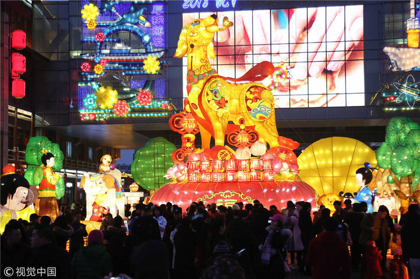 2018年3月2日,沈阳市民在中街豫龙城元宵节灯会上观看花灯。黄金崑/视觉中国