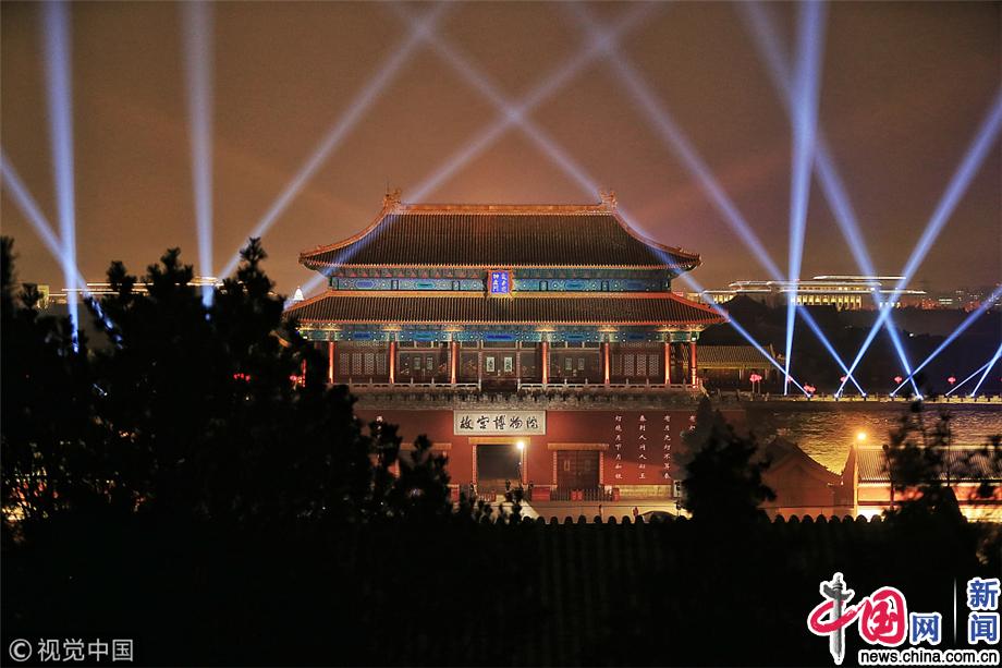 2019年2月18日,北京,农历正月十四,故宫博物院神武门、东北角楼、东南角楼、午门等地灯光正在进行调试,吸引不少摄影爱好者和市民游客拍照观赏、提前尝鲜。宋佳音/视觉中国