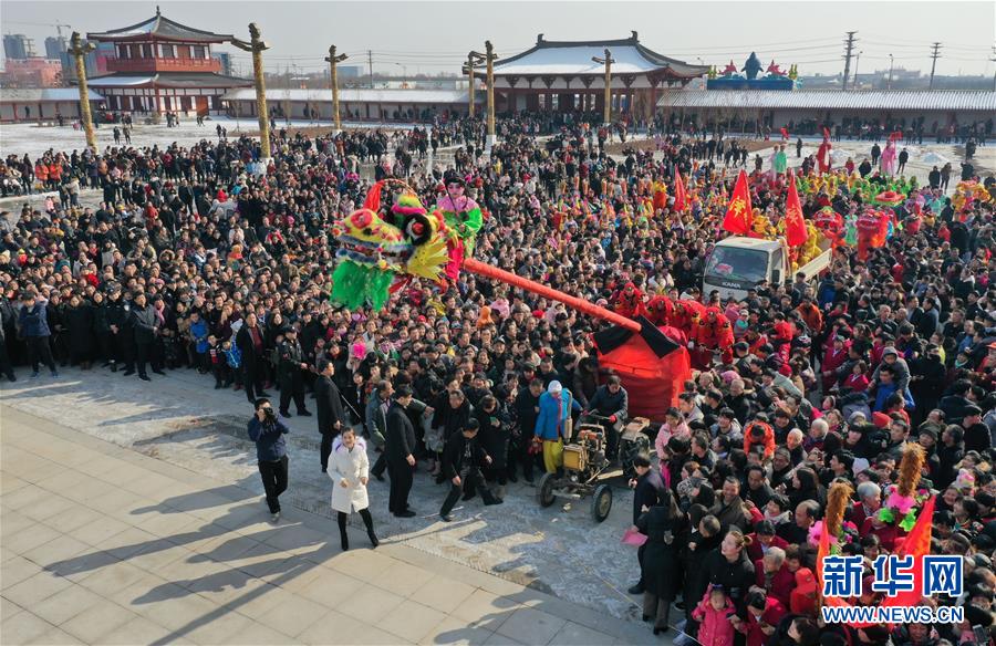 2月18日,演员在表演招子鼓(无人机拍摄)。 当日,河北省隆尧县举行非遗展演活动,艺人们现场展示了秧歌戏、招子鼓、泽畔抬阁等非遗项目,迎接元宵佳节的到来。 新华社记者 牟宇 摄