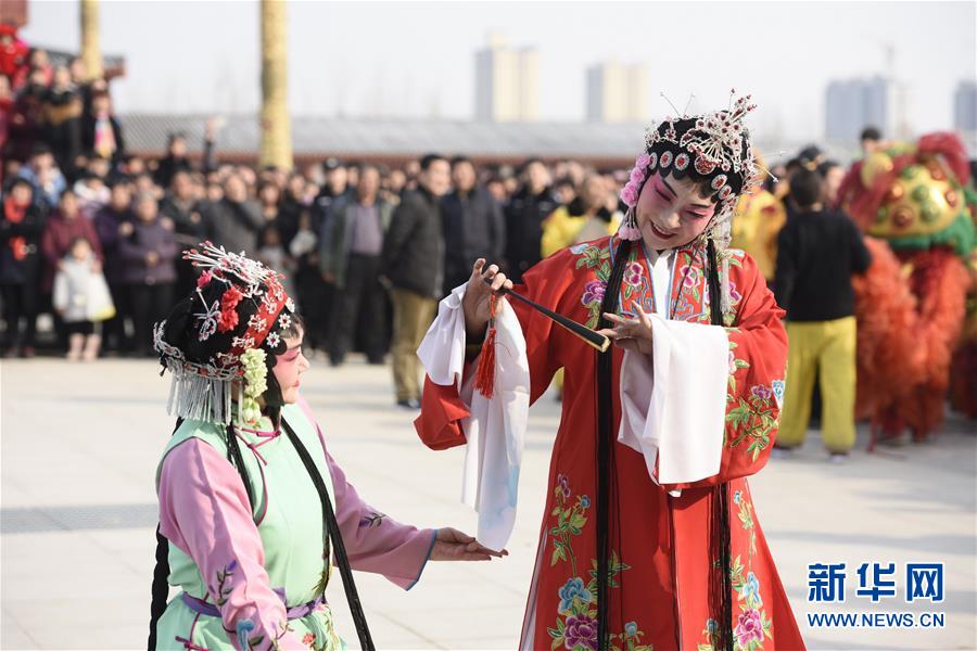 2月18日,演员在表演秧歌戏。 当日,河北省隆尧县举行非遗展演活动,艺人们现场展示了秧歌戏、招子鼓、泽畔抬阁等非遗项目,迎接元宵佳节的到来。 新华社记者 牟宇 摄